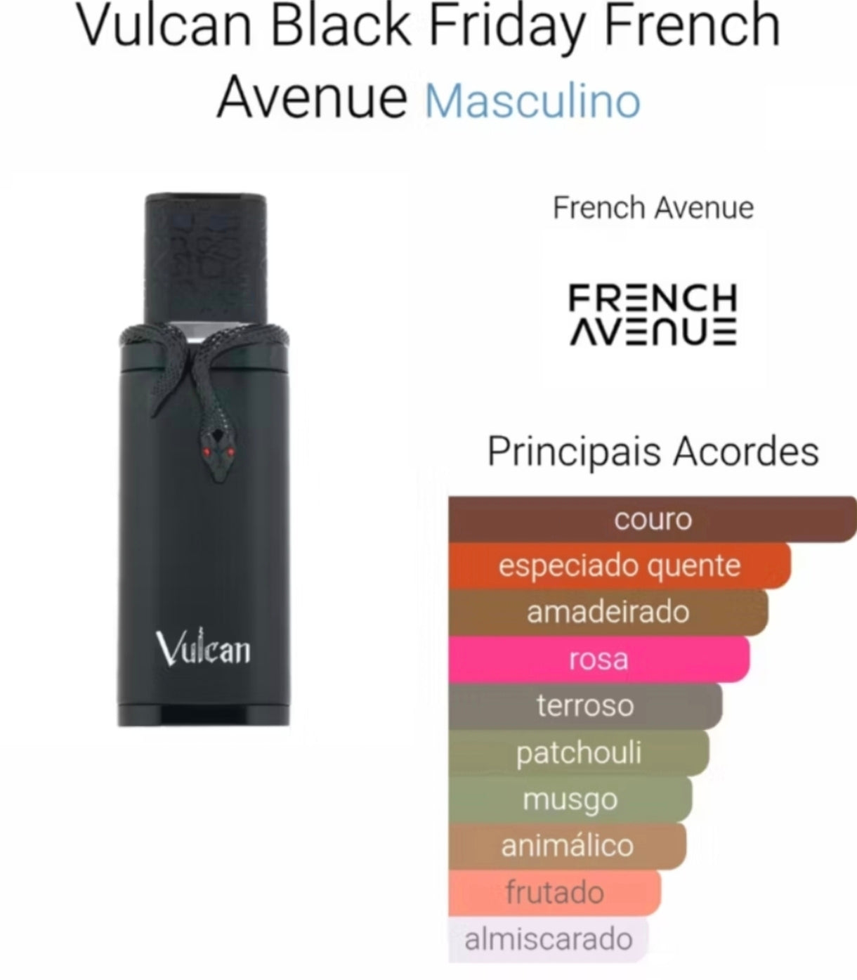 O Vulcan Black Friday Eau de Parfum 100ml da French Avenue é um perfume masculino intenso e ousado, pertencente à família Couro, lançado em 2025. Criado para homens que buscam uma fragrância dark, sofisticada e extremamente marcante, ele entrega presença e personalidade desde a primeira borrifada.